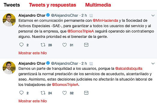 Mediante su cuenta de Twitter, el Alcalde Char indicó además que las decisiones judiciales no afectarán la situación laboral de los trabajadores y expresó que la Alcaldía de Barranquilla acata las decisiones adoptadas por la Fiscalía.