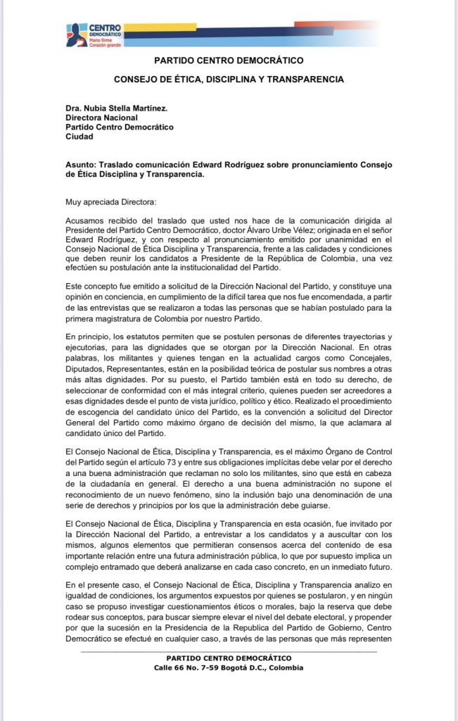 Mediante un comunicado dirigido a la directora de ese partido, Nubia Estella Martínez y pidiendo el aval del jefe natural de la bancada, el expresidente Álvaro Uribe, el comité asegura que coinciden con los argumentos que Rodríguez argumentó en la apelación del fallo y por eso decidieron omitir el proceso disciplinario que enfrentaba el congresista, fiel escudero del presidente Iván Duque.PUBLICIDAD“Coincidimos con el señor Edward Rodríguez en que el concepto del Consejo Nacional de Ética, Disciplina y Transparencia (…) no es posible recurrirlo ante alguna entidad o instancia. (….) En el presente caso no estamos en presencia de un proceso disciplinario que se haya adelantado contra ningún candidato ni de ninguna sanción”, se lee en el documento.