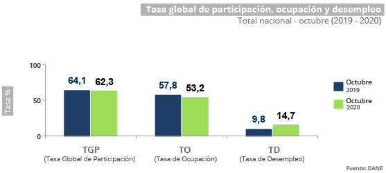 Para el mes de octubre de 2020, la tasa de desempleo fue 14,7%, lo que significó un aumento de 4,9 puntos porcentuales frente al mismo mes del año anterior (9,8%). La tasa global de participación se ubicó en 62,3%, lo que representó una reducción de 1,8 puntos porcentuales frente a octubre del 2019 (64,1%). Finalmente, la tasa de ocupación fue 53,2%, presentando una disminución de 4,6 puntos porcentuales respecto al mismo mes del 2019 (57,8%).