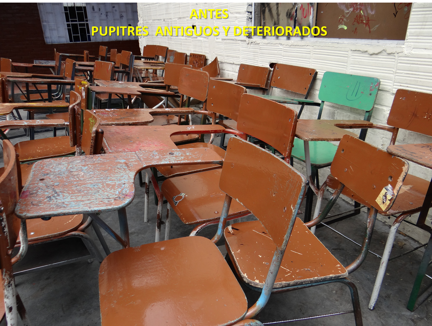 El estado de los pupitres remplazados no era el mejor, estaban deteriorados por el uso durante años y con las marcas propias del paso estudiantil.
