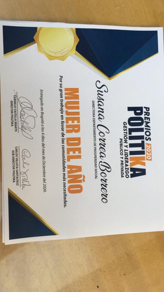 SE LE OTORGA EL GALARDÓN POR SU GRAN TRABAJO DURANTE LA PANDEMIA EN FAVOR DE LOS MÁS NECESITADOS EN ESPECIAL DE LOS DAMNIFICADOS POR EL HURACÁN IOTA EN PROVIDENCIA Y SAN ANDRÉS ISLAS